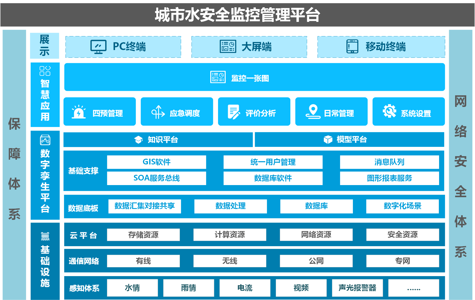 城市水安全監(jiān)控管理平臺分為預案管理、預演、預報預警、監(jiān)控一張圖、應急調度、評價分析、日常管理七個功能模塊。