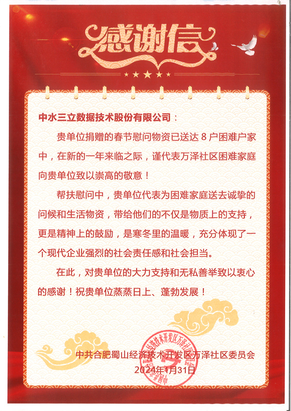 本次愛心捐贈活動受到了萬澤社區(qū)黨委的高度好評,特向公司出具感謝信。未來,中水三立將繼續(xù)堅守初心,積極踐行社會責任,持續(xù)關(guān)注并實踐慈善及公益活動,用實際行動詮釋企業(yè)使命與擔當。