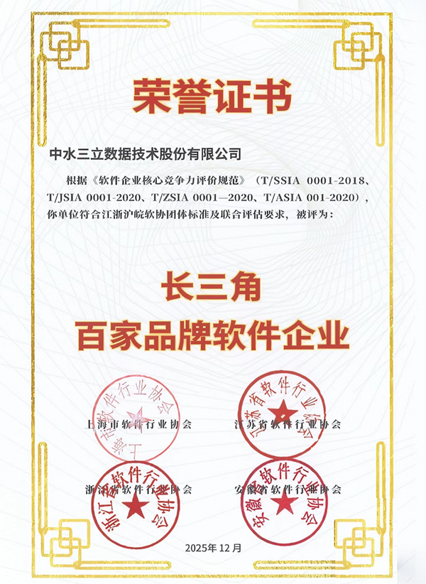 近日,滬蘇浙皖四省市軟件行業(yè)協(xié)會聯(lián)合發(fā)布“2025長三角百家品牌軟件企業(yè)”名單,中水三立成功上榜,成為涉水?dāng)?shù)智化領(lǐng)域唯一入選企業(yè),充分彰顯了公司在軟件領(lǐng)域的持續(xù)創(chuàng)新實力與卓越實踐應(yīng)用成效!