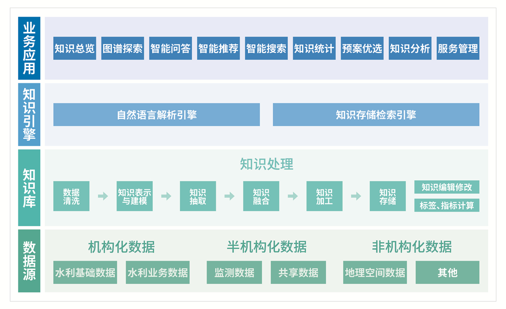 水利知識平臺通過匯聚整編各類水利基礎(chǔ)數(shù)據(jù)和水利業(yè)務(wù)資料,基于自然語言解析、機器學(xué)習(xí)、深度學(xué)習(xí)等人工智能算法模型構(gòu)建知識引擎,通過開發(fā)知識平臺對知識庫和知識引擎進行統(tǒng)一管理,提供知識檢索、知識推薦、知識分析等知識服務(wù)功能,通過統(tǒng)一的服務(wù)接口支撐水利業(yè)務(wù)應(yīng)用。水利知識平臺作為一個基礎(chǔ)技術(shù)平臺,通過自然語言處理(NLP)和機器學(xué)習(xí)技術(shù)構(gòu)建水利領(lǐng)域知識體系,采用知識圖譜與RAG知識庫雙軌架構(gòu),以知識服務(wù)的形式對平臺功能進行統(tǒng)一管理,對外提供穩(wěn)定、可靠的知識服務(wù),后續(xù)水利知識平臺將持續(xù)精細(xì)化落地應(yīng)用場景。