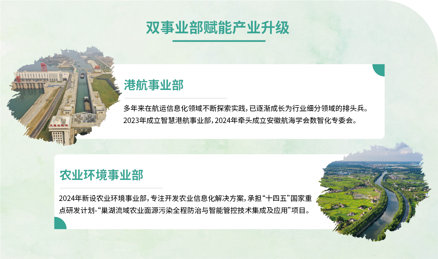 在航運領(lǐng)域,不斷探索實踐,已逐漸成長為行業(yè)細分領(lǐng)域的排頭兵。2023年成立智慧港航事業(yè)部,2024年牽頭成立安徽航海學會數(shù)智化專委會。在農(nóng)業(yè)領(lǐng)域,專注農(nóng)業(yè)信息化解決方案的開發(fā)與落地。2024年新設(shè)農(nóng)業(yè)環(huán)境事業(yè)部,承擔了“十四五”國家重點研發(fā)計劃——“巢湖流域農(nóng)業(yè)面源污染全程防治與智能管控技術(shù)集成及應(yīng)用”項目。