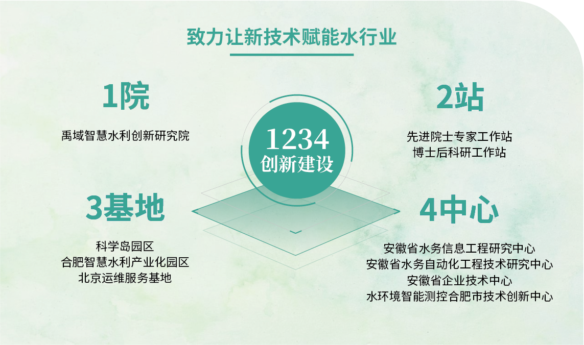 搭建1234創(chuàng)新平臺建設(shè),高度重視創(chuàng)新型人才引進、培養(yǎng)機制,被評為“安徽省創(chuàng)新型企業(yè)”“安徽省科技創(chuàng)新貢獻獎”“安徽省大數(shù)據(jù)企業(yè)”等。建有院士專家工作站、博士后科研工作站、安徽省企業(yè)技術(shù)中心、安徽省水務(wù)自動化工程技術(shù)研究中心等多個省市創(chuàng)新平臺,擁有專業(yè)的產(chǎn)品研發(fā)團隊。