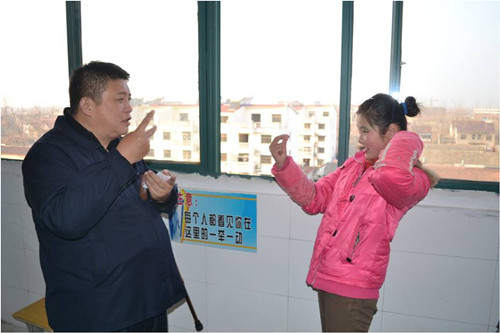 圖為李靜董事長(zhǎng)與聾啞人同學(xué)用手語(yǔ)交流