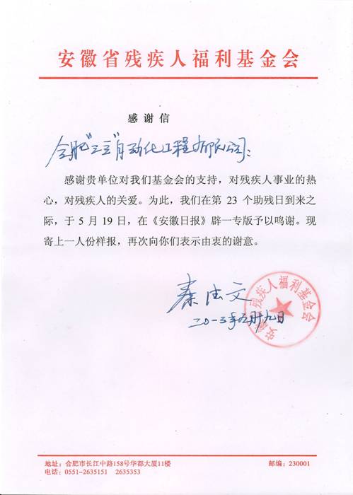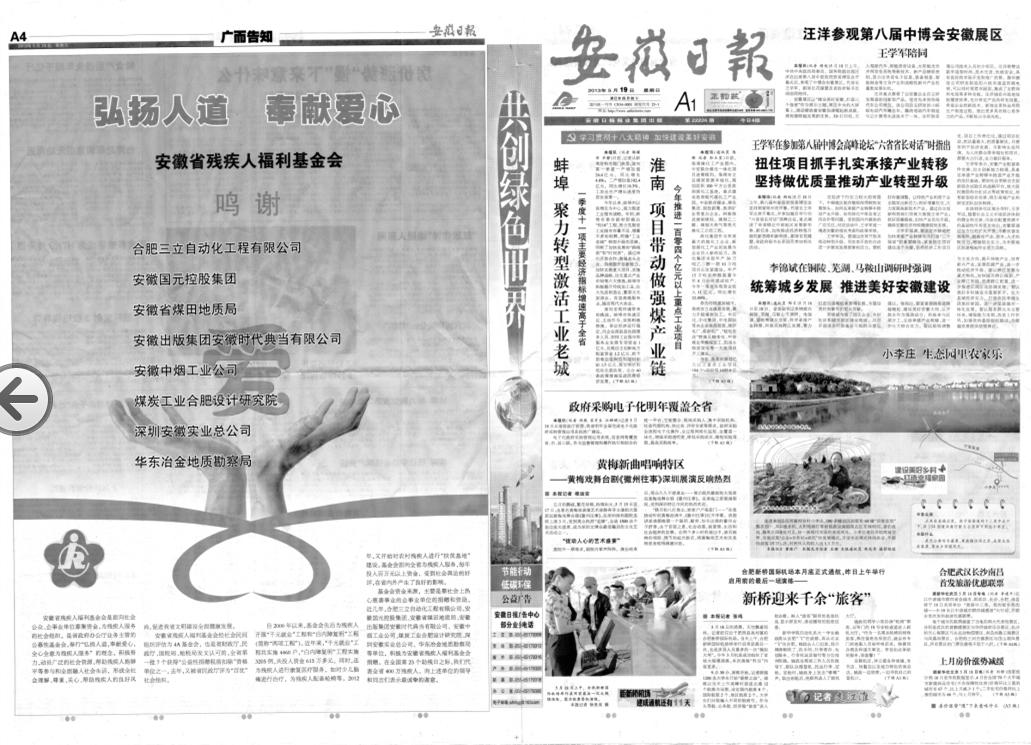 圖為安徽省殘疾人福利基金會于5月19日在安徽日報上對我公司的鳴謝