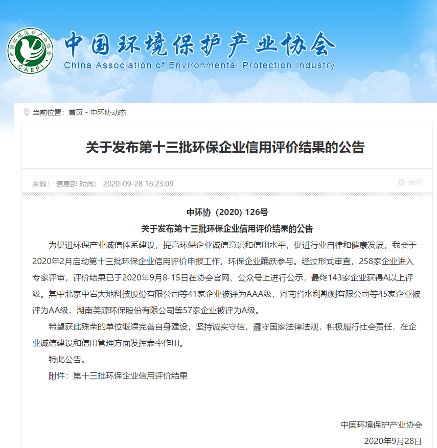 中水三立成功獲批第十三批中國(guó)環(huán)保企業(yè)AAA信用等級(jí)企業(yè)