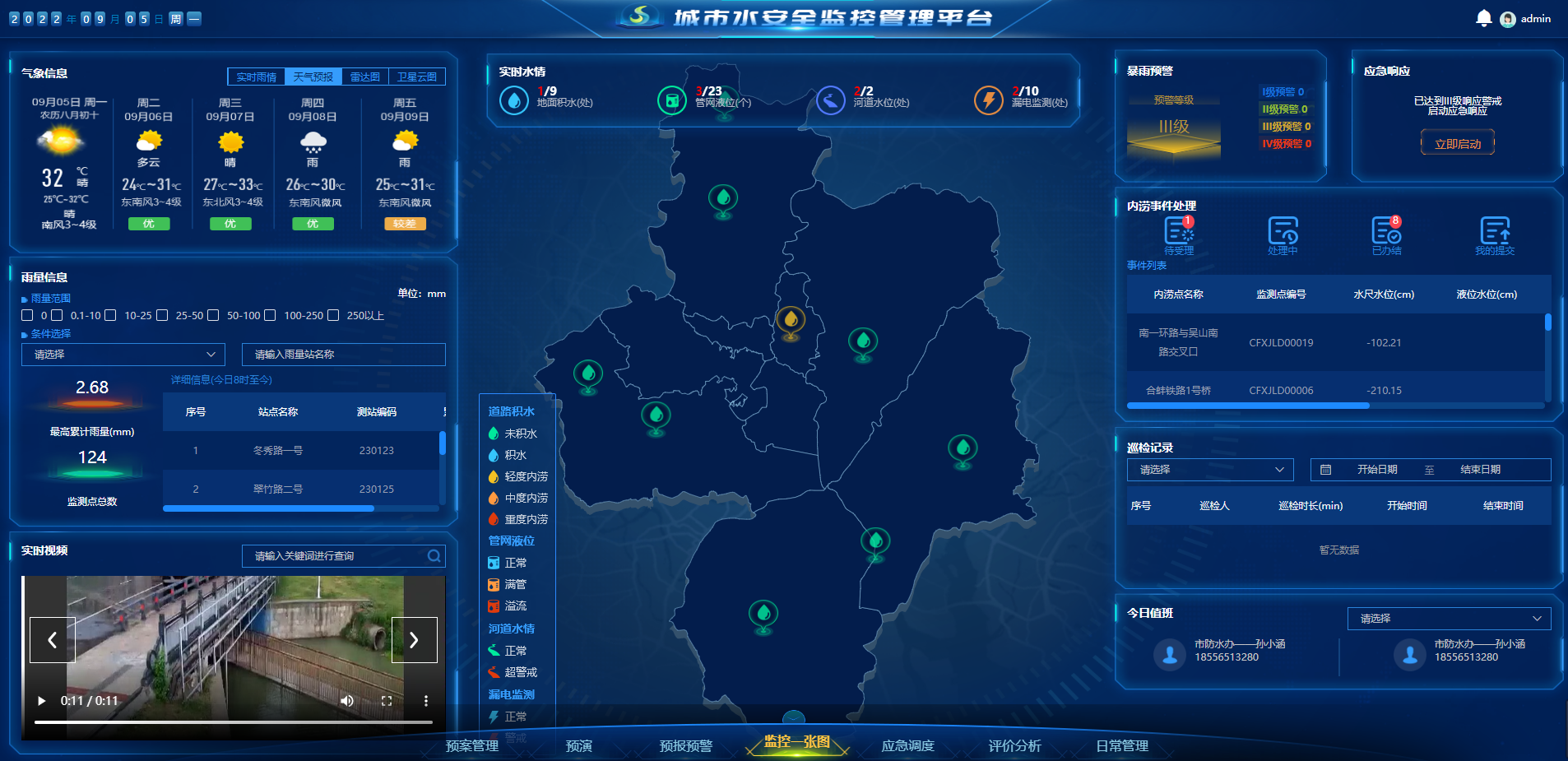 一張圖全覽全知。包括對水雨情的實時監(jiān)控,在地圖上展示地面積水、河道水位、管網(wǎng)液位和漏電監(jiān)測的分布和狀態(tài);暴雨預(yù)警狀態(tài);應(yīng)急響應(yīng)狀態(tài);內(nèi)澇事件處理;巡檢記錄;監(jiān)控視頻列表等。