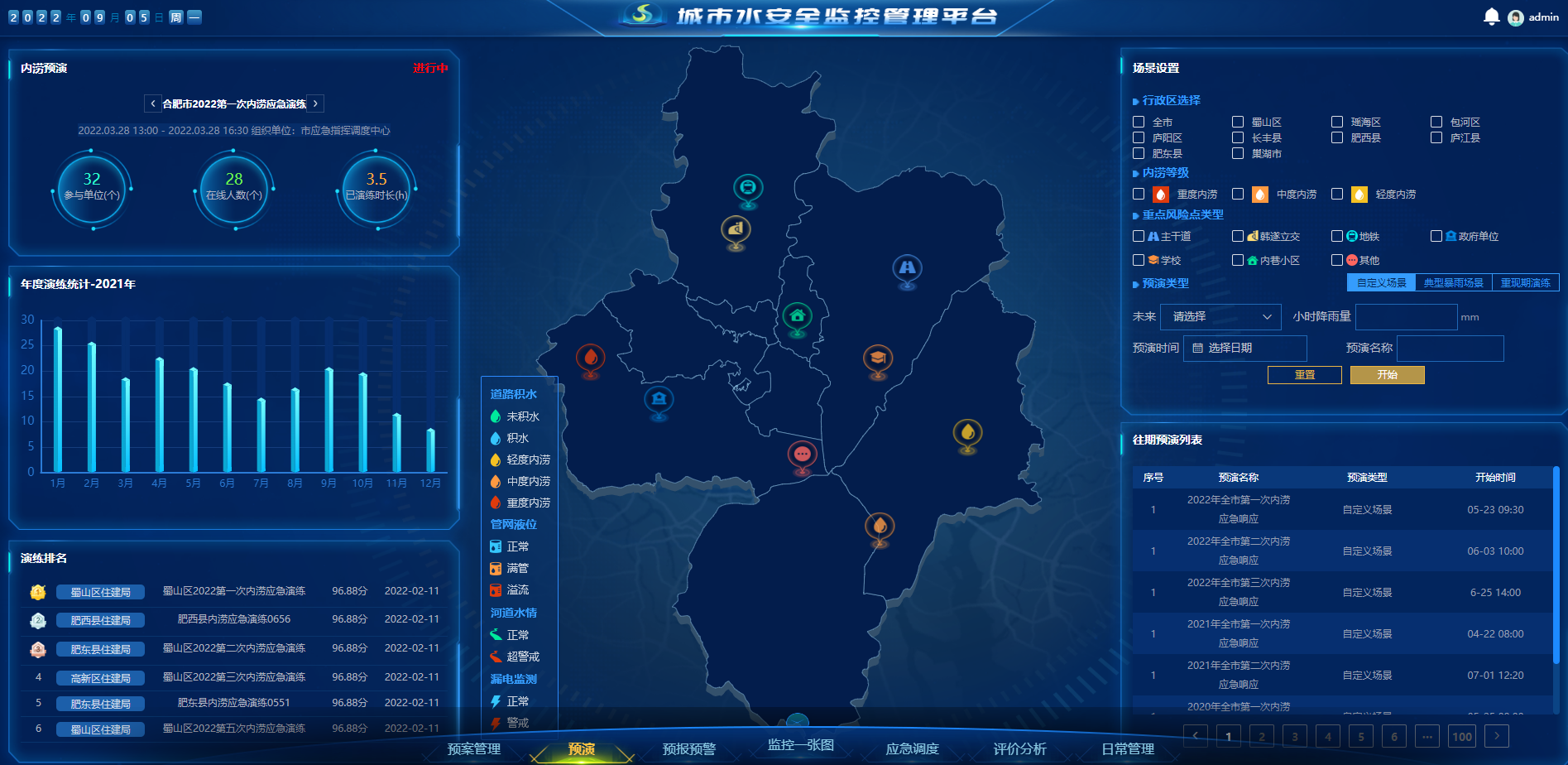 預(yù)演模塊通過設(shè)置不同降雨場景,包括自定義場景、典型暴雨場景以及根據(jù)歷史數(shù)據(jù)復(fù)盤已發(fā)生過的城市內(nèi)澇場景,提前對所有可能發(fā)生的極端突發(fā)狀況進行定期模擬演練。