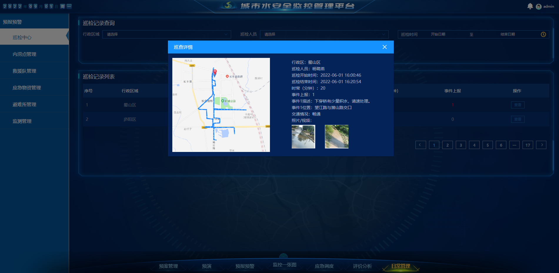 日常管理模塊中可進行日常移動巡檢、設(shè)備檢修、內(nèi)澇點維護、應(yīng)急物資儲備等工作。