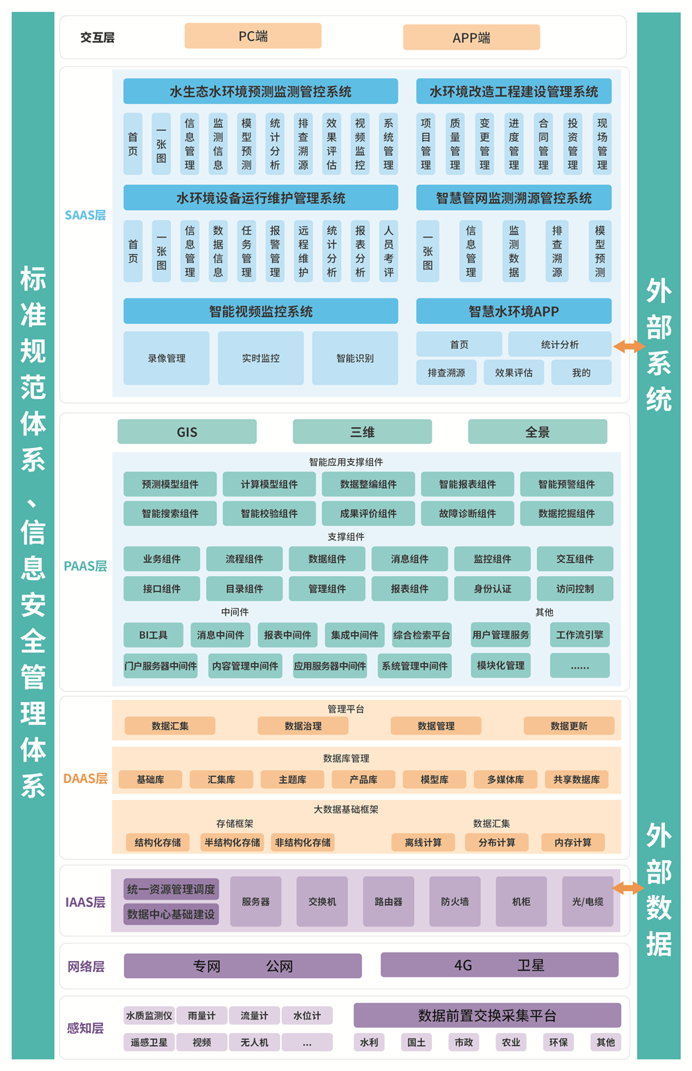 智慧水環(huán)境產品運用信息化技術,利用收集和監(jiān)測等手段獲取氣象、水文及水質數據,對河道河段、排口及支流進行趨勢預警,使用數據挖掘、人工巡河和公眾監(jiān)督對水污染進行行政分區(qū)、支流和污染源等排查溯源,本著“污染在水里,根源在岸上,關鍵在排口,核心在管網”的指導思想,當溯源到排口之后,啟動管網溯源系統,最終追溯到污染的真正源頭,針對溯源結果提出河湖水環(huán)境改善的工程措施和非工程措施(管理措施)等,對于提出的工程措施通過水環(huán)境改造工程建設管理系統對其進行質量、安全、進度等過程把控;并將水環(huán)境綜合治理過程中運用到的水質監(jiān)測、水文監(jiān)測、氣象監(jiān)測、視頻監(jiān)控等設備的運行狀態(tài)實時監(jiān)控起來,定時進行維修養(yǎng)護巡檢等保障設備正常運行;最后對水環(huán)境改善措施實施后的治理效果進行效果評估,旨在是達到河道考核標準。